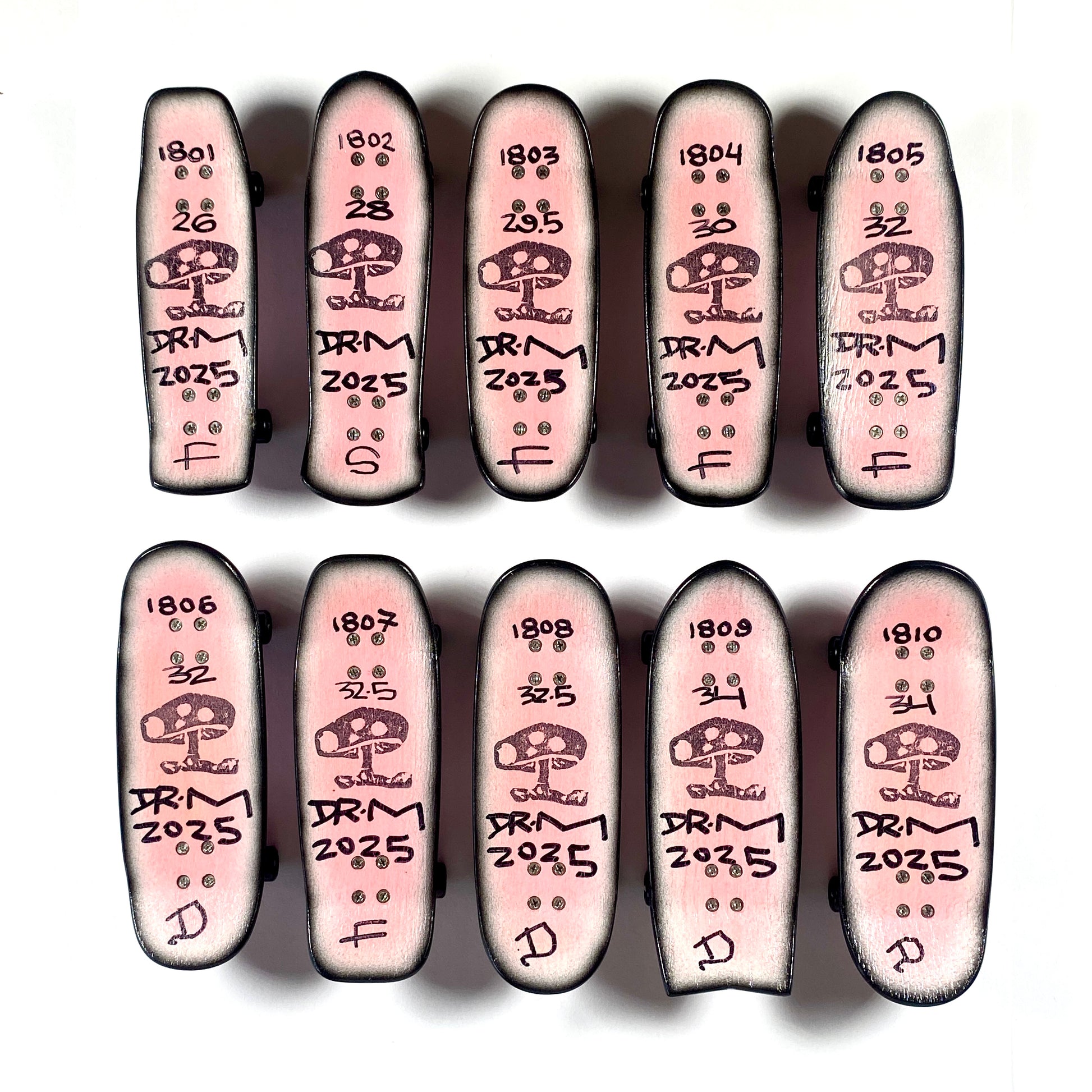 Hand shaped decks, Airbrushed, Embossed, Stamped, and Numbered